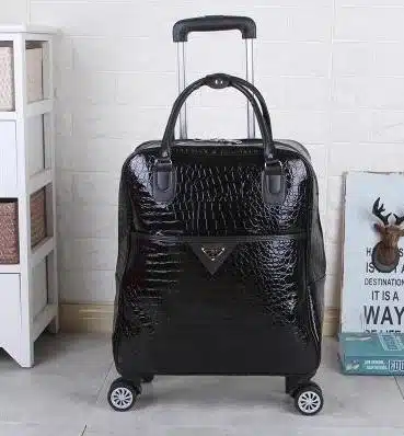 Le design du sac de voyage à roulettes pour femme en similicuir noir est à la fois pratique et élégant. Les détails en métal doré ajoutent une touche de sophistication, tandis que les coutures soignées assurent une finition de qualité. La taille du sac est parfaite pour un court séjour, un week-end ou une escapade de quelques jours.